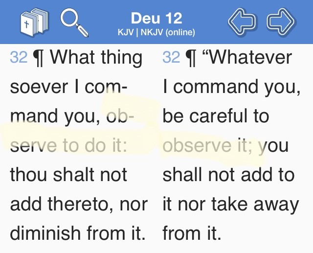 Deut 12:32 (KJV)ΒΆ What thing soever I command you, observe to do it: thou shalt not add thereto, nor diminish from it. In the original Hebrew To observe “to do it” is left out of the NKJV translation.